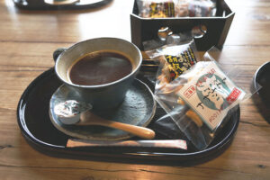 フレンチプレス方式で煎れたコーヒーや抹茶、おかきパフェなどがいただけます。